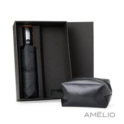 Composto por garrafa preta, confeccionada com dupla parede em Inox Necessaire com alça em material sintético na cor preta Tamanho: 24,6 x 6,7 cm Gravação: Laser na garrafa, silk na necessaire e na tampa da caixa