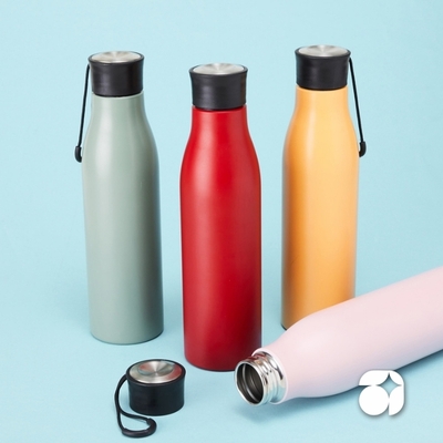 Garrafa térmica em inox 304 com capacidade de 420 ml, incluindo peneira para infusão de bebidas.