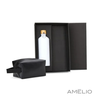 Gravação: Laser na garrafa e canivete. Silk/Digital na caixa